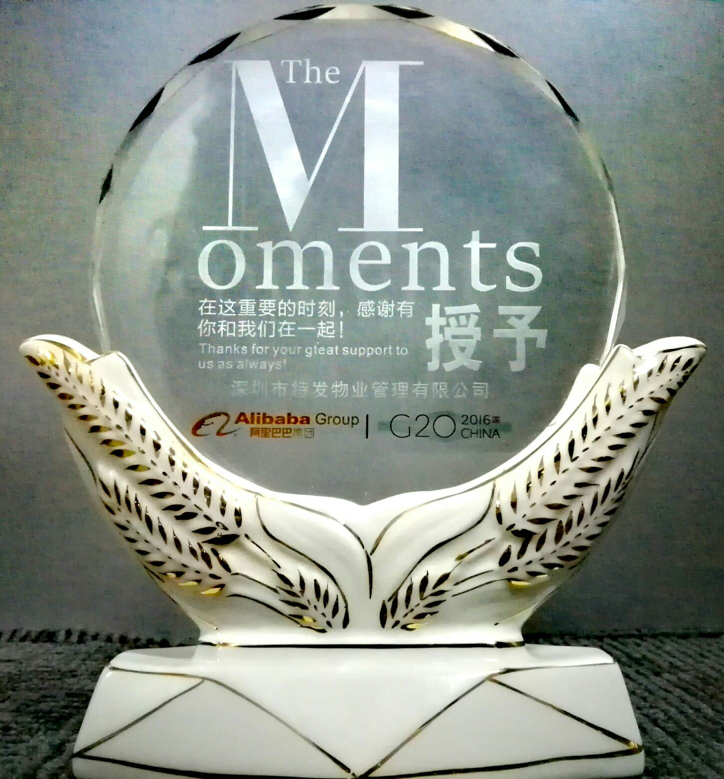 特發(fā)團隊敢為人先,追求卓越,抱著客戶第一的理念,通過會務、安全、工程、保潔等等部門間的團隊合作,我們在接待中擁抱一切變化,用誠信、敬業(yè)和激情的態(tài)度感染了來訪的各國嘉賓,在為期一周的高強度接待中,我們共接待了包括4名國家元首和WTO總干事在內(nèi)的560余名國際客人。這一切的努力也被阿里巴巴集團看在眼里,在G20杭州峰會結束后,特意授予特發(fā)物業(yè)一個特殊的榮譽——“G20保障特殊貢獻獎”。